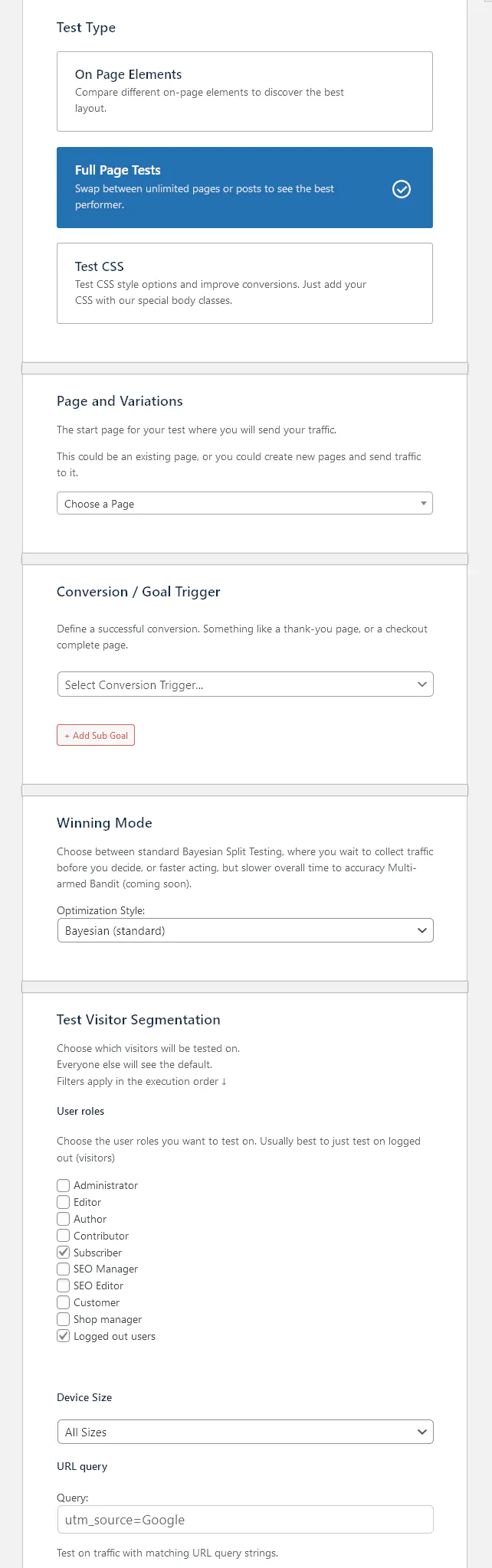 AB Split Test nos permite tanto experimentar con todos los visitantes del sitio web o bien segmentar el público para pruebas A/B más precisas. Comenzaremos eligiendo una de estas tres opciones.