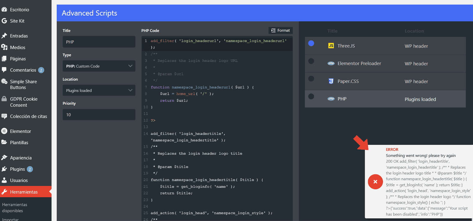 Advanced Scripts detecta cualquier error de PHP y nos advierte antes de aplicarlos a nuestro sitio. Esto nos salva de romper nuestra web por una omisión o un caracter mal escrito.
