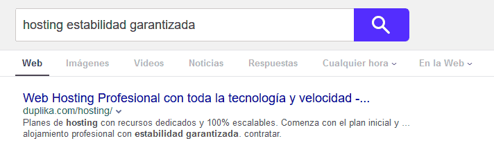 BING utilizará la primera oración que contenga la búsqueda, como la descripción de nuestro sitio. Si dicha búsqueda no se encuentra incluída, entonces mostrará la primera oración de la página. Sin embargo, Bing le dará prioridad a la URL, siendo que, si buscamos “hosting con estabilidad garantizada”, el resultado es este: