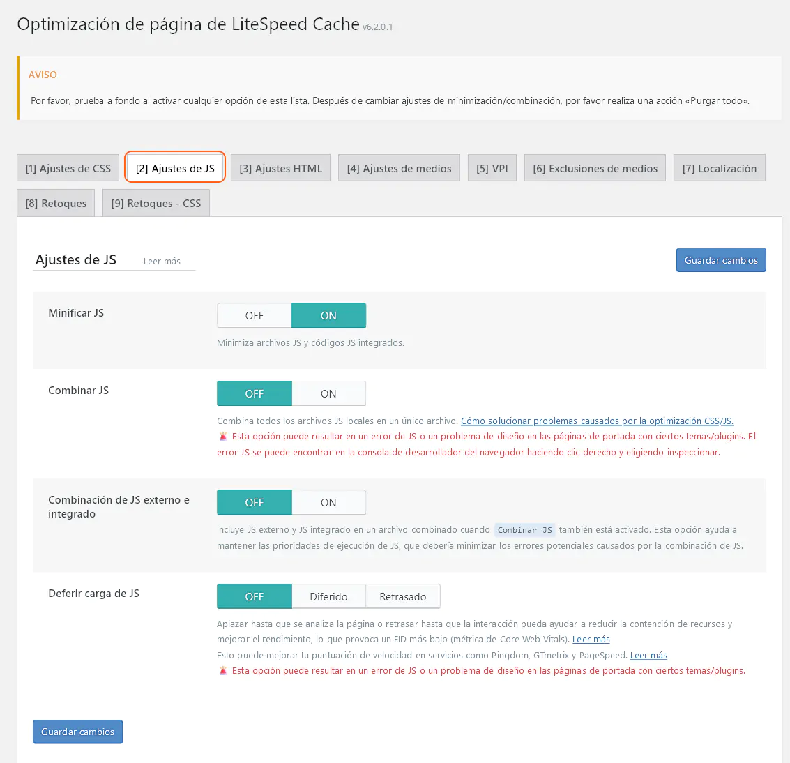 Optimización de Página: solapa ‘Ajustes de JS’