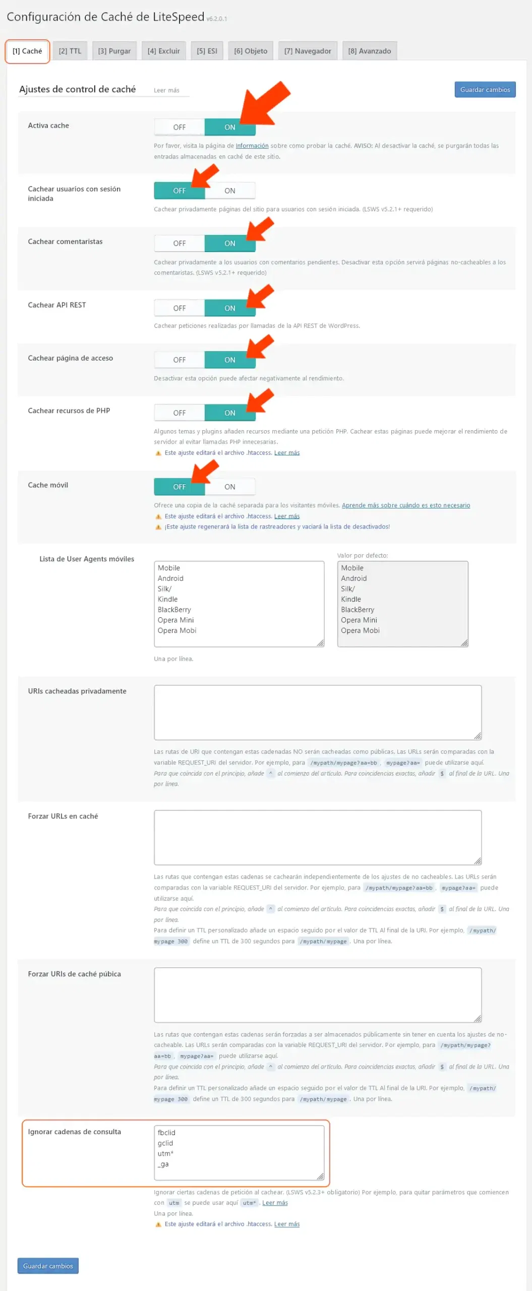 - User Agents a no cachear: listar aquí user agents que no quieres almacenar en el caché.