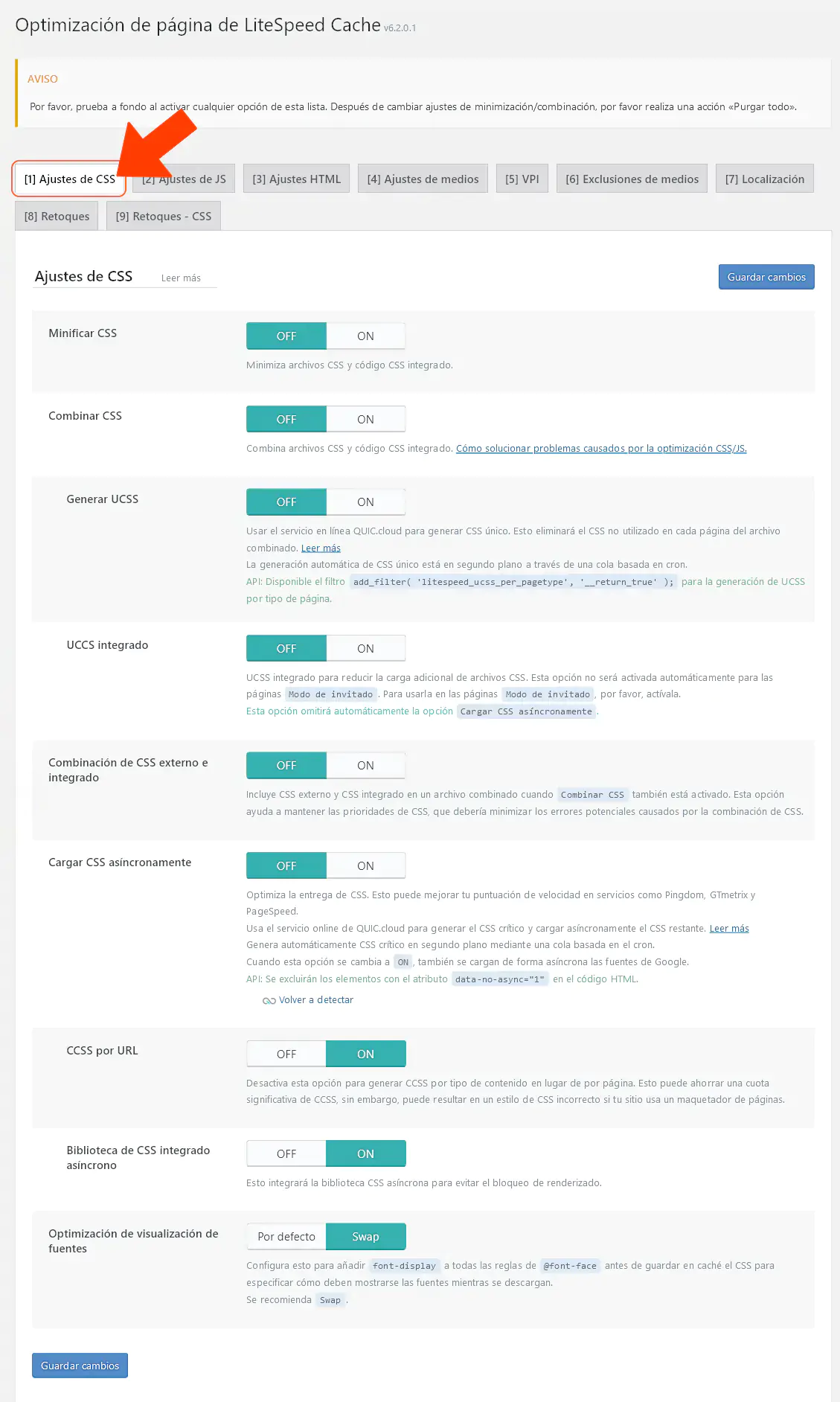 - Cachear recursos de PHP: ON. Esta función es especialmente útil para temas y plugins con código mal depurado y/o errores de programación.