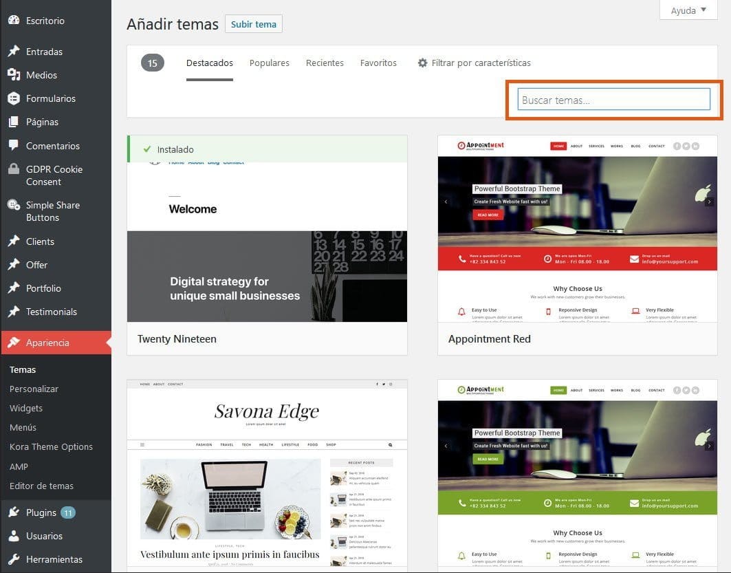 Elije e instala un tema del directorio de temas oficial de WordPress