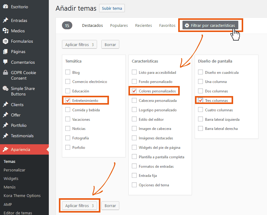 Sin embargo, normalmente éste no es el caso., y razón por la que puede ser muy útil emplear el Filtro de funciones. Por ejemplo, puedes buscar un tema que ordene los textos e imágenes en dos columnas, y cuya cabecera pueda ser personalizable al igual que su menú, y que sea indicado para una página de noticias. Simplemente tilda las características que mejor reflejen el concepto de página que estás buscando, y luego pulsa el botón “Aplicar Filtros“.