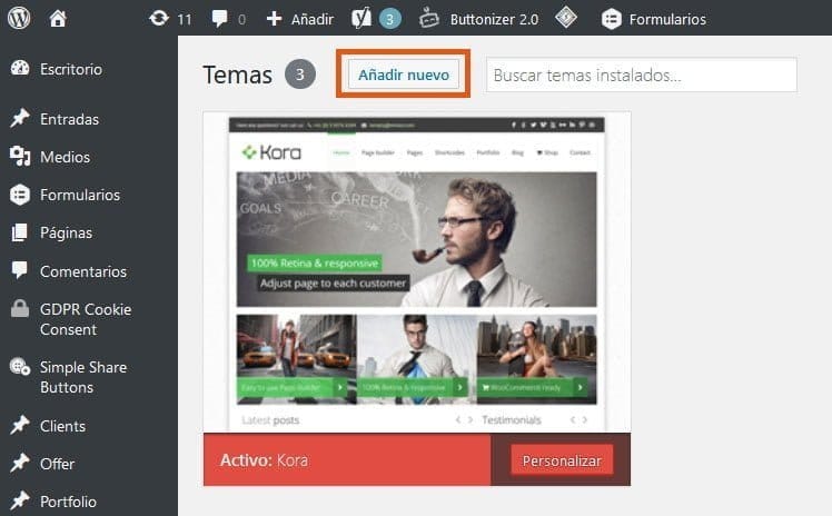 En la pantalla de temas visualizarás todos los themes instalados en tu aplicación. Si lo que deseas es agregar un theme nuevo, simplemente haz clic en el botón que dice “añadir nuevo“.