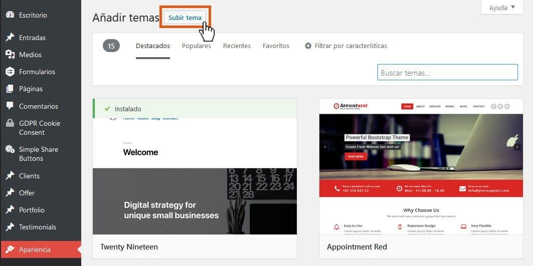 Si posees los archivos de un tema con anterioridad, ya sea porque lo has comprado o descargado de otra parte (hay numerosos sitios donde comprar temas profesionales que se adaptan con precisión y estilo a rubros específicos), puedes subirlos con botón Subir tema en la parte superior de la interfaz.