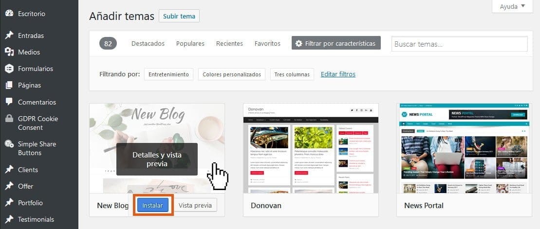 Ahora verás en pantalla todos los temas que concuerden con tus criterios de búsqueda. Desliza el ratón sobre cualquiera de ellos y verás dos opciones: ver una demostración del tema, o instalarlo. Ver una demostración te abrirá una ventana adicional en el navegador donde probablemente verás una página real que está empleando ese tema, y es la mejor forma de constatar el diseño y sus funcionalidades. Una vez que elijas el tema que mejor se adapte a tu rubro, pulsa el botón azul de instalación.