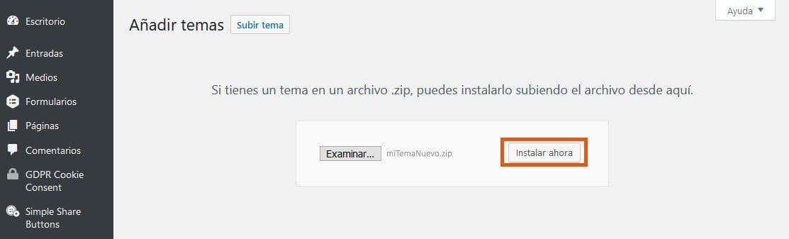 A continuación, cliquea en el botón Elegir archivo, selecciona el archivo de tu tema en tu computadora local (probablemente un archivo con extensión .RAR +o .ZIP), y luego presiona el botón Instalar ahora.