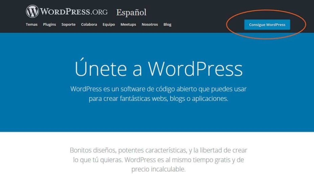 En WordPress.org, notarás un botón azul, arriba de todo, que dice “consigue WordPress”.