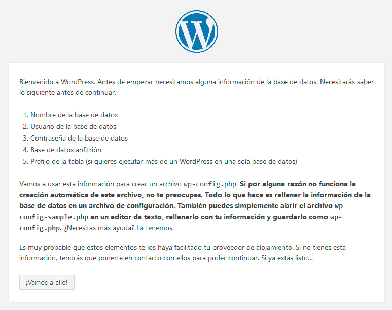 Hacemos clic en Crear un archivo de configuración y luego en ¡Vamos a ello! Ahora, WP solicitará los datos de conexión a tu base de datos MySQL, requisito fundamental para poder utilizarlo. Los datos son: