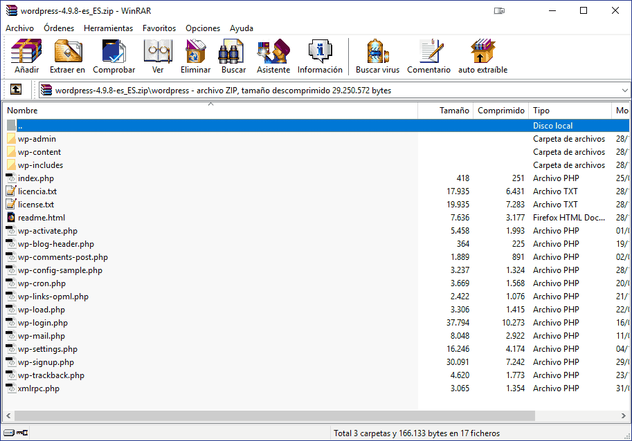 Al presionarlo se te redireccionará a la página de descarga, donde obtendrás un archivo .zip con una carpeta “WordPress” llena de directorios y más archivos dentro.