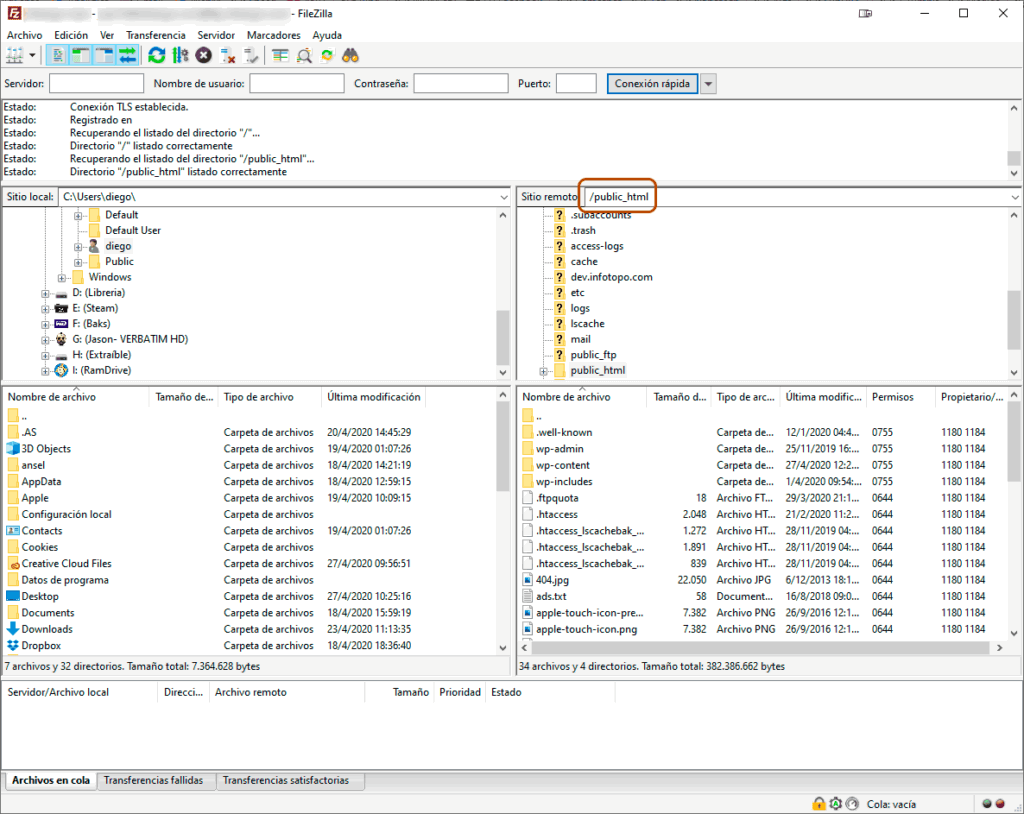 Nota: en este caso, la ruta pública del sitio es /public_html pero en otros servidores puede ser diferente (por ejemplo, contener números antes del /public_html).
