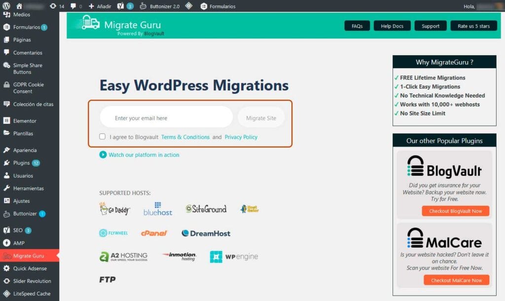 El plugin es gratis pero, como suele suceder con todo lo que es gratis, al menos una cosilla nos pide a cambio; en este caso, un correo electrónico nuestro. Concretado esto, seleccionaremos “I agree to Blogvault“, es decir que aceptaremos los Términos y Condiciones del plugin para poder emplearlo (casi contrario, no podremos usarlo) y daremos clic al botón “migrate site“, es decir Migrar Sitio.