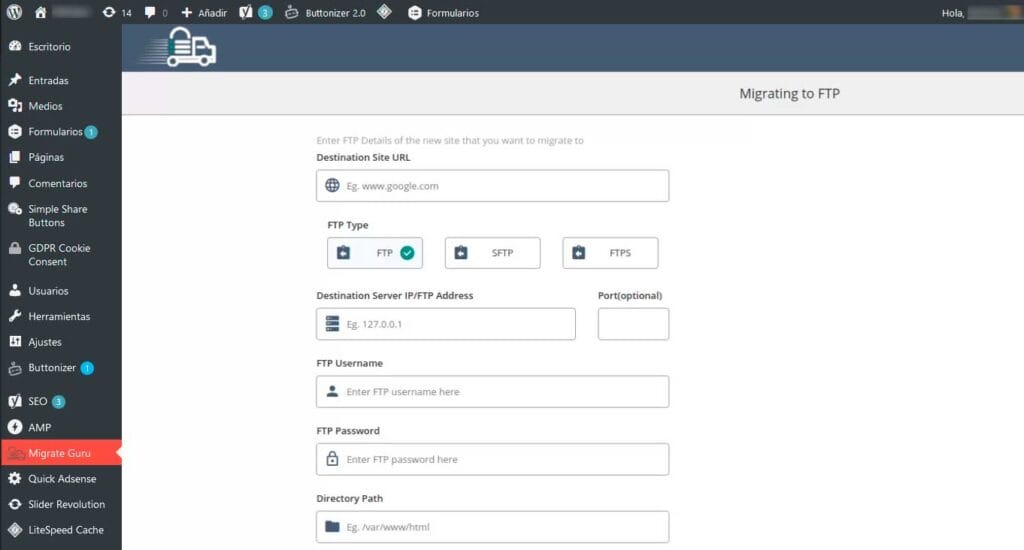 Volviendo a MigrateGuru, este plugin necesita de las credenciales de acceso FTP (algo que, si no lo tienes, te lo proveerá tu empresa de Hosting). Además, necesitás conocer la ruta de tu instalación de WordPress (por defecto, se hallará en la raíz de tu URL, pero si no es el caso también puedes consultar a tu proveedor de hosting para estar seguro).