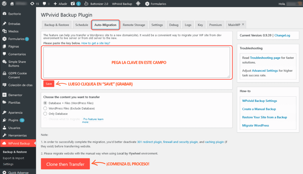 En el sitio original, el que pretendes mudar, haz clic en la siguiente solapa “automigration” y sigue las instrucciones de la captura. Es MUY fácil.