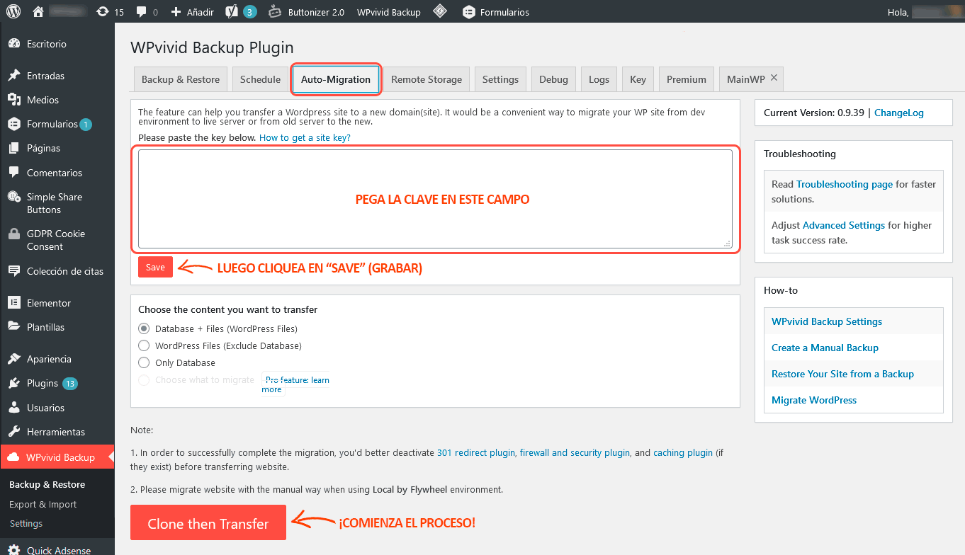En este caso, es suficiente con que conozcas lo obvio: las credenciales de acceso a tu Escritorio de WordPress para ambos servidores, es decir el usuario y contraseña de tu sitio actual, y lo mismo para la instalación de WP destino de la migración. Ojo: ya debes contar con una instalación de WordPress “limpia” (salvo por el plugin WPvivid) en el servidor adónde mudarás tu sitio.