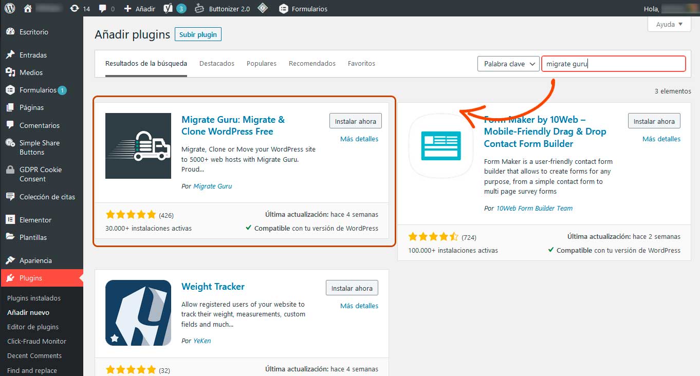 En la ventana de Plugins usaremos el buscador de plugins para encontrar e instalar Migrate Guru.