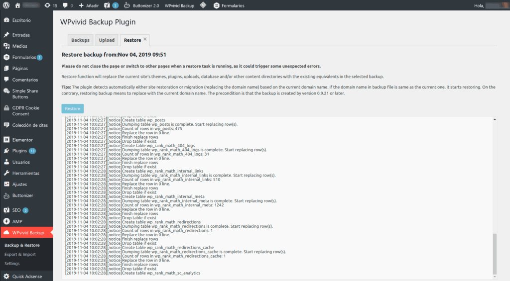 Una vez que visualizas el archivo del backup creado, presiona la opción “Restore” (es decir recuperar). El proceso que sigue no debería tardar más de unos segunditos (no cierres la solapa, por las dudas).