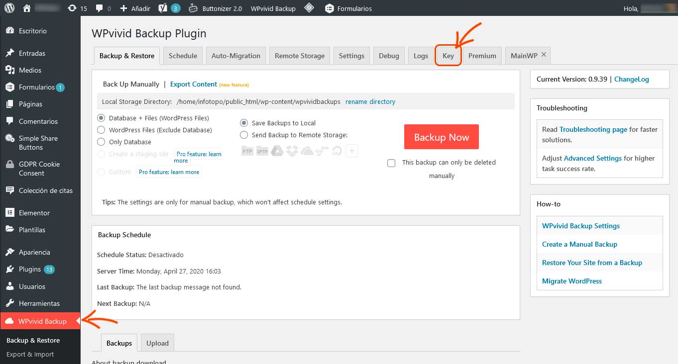 Escrolea un poquito si hace falta hasta encontrar la solapa “Backups”. En esa región del panel deberías ver al menos un renglón con el backup que el mismo plugin, desde el sitio “viejo”, envió para acá (si no lo ves, por favor presiona las teclas ctrl+f5 y recarga la página).