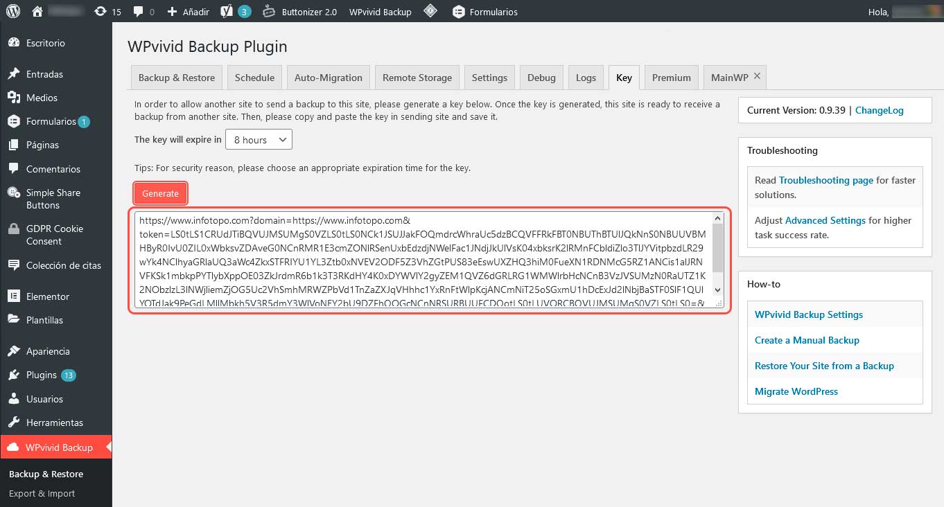 Como puedes ver, el botón “generate” creará una clave (llave) especial para tu sitio. La clave podrá ser “copiada y pegada” a la usanza de Windows para poder informarle al plugin WPvivid en el sitio a mudar que éste es el destino validado.