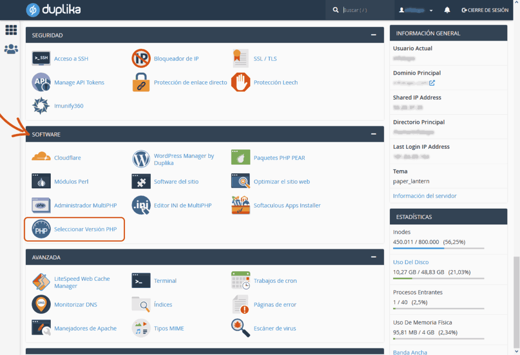 Una vez logueado, busca la herramienta ‘Seleccionar Versión PHP’ en la categoría software como mostramos en la captura inferior.