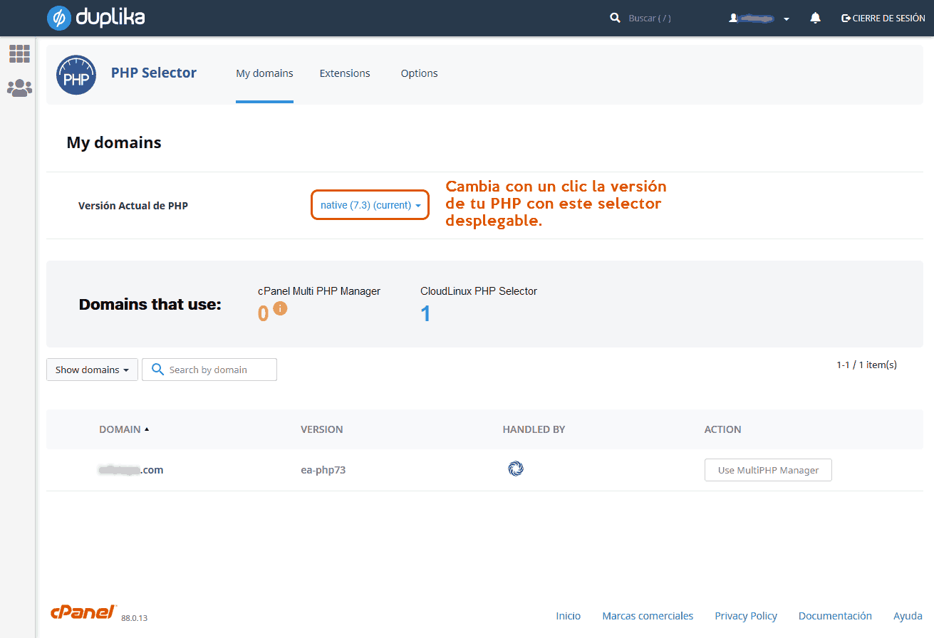 Gracias a nuestra integración con Cloudlinux, hemos lanzado el nuevo Selector de PHP, una “perilla” virtual para que eligas la versión de PHP que quieras.