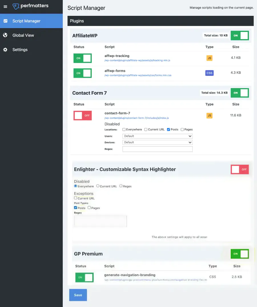 Como podemos ver en la captura superior, muchas opciones de Perfmatters se activan con un clic. Además, nos deja decidir en dónde correr los scripts según su necesidad (por Entradas, por Páginas, por URLs específicas, incluso por tipo de dispositivo). Un buen ejemplo de uso es con Contact Form, script que debería cargarse únicamente en el área de contacto.