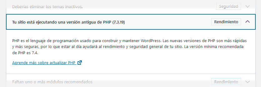 Problemas críticos: es lo que deben centrar tu atención. Aquí encontraremos problemas de velocidad y seguridad graves, conflictos PHP y agujeros en la defensa del sitio. Por supuesto, siempre te indica la solución. Por ejemplo, se te permite activar PHP 7.4, imagick, opcache o cualquier otra extensión de PHP que debas emplear.