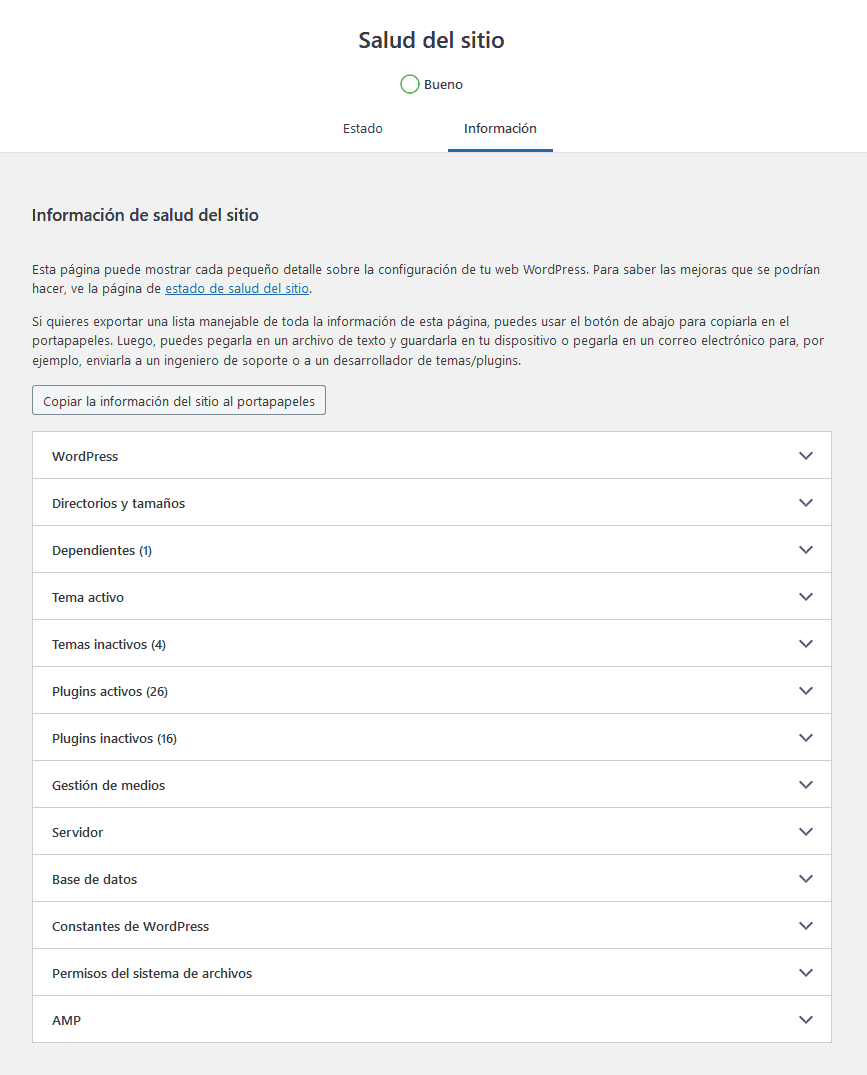 Si necesitas exportar la lista de toda la información de salud de tu sitio en WordPress, simplemente haz clic en el botón “Copiar la información del sitio al portapapeles”. Hecho esto, podrás pegarla en un archivo Word, en un correo, en un archivo de tu bloc de notas o donde lo desees.