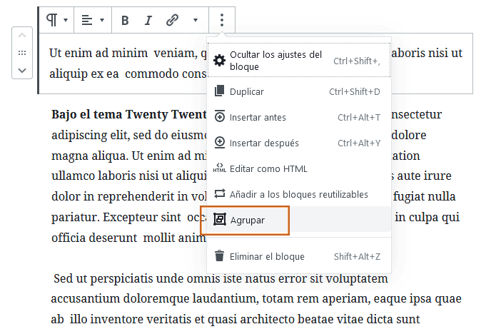 Nota: cuando creas un grupo, puedes luego crear bloques directamente dentro de él (cliqueando el signo corriente “+”), pero si deseas añadir bloques creados previamente dentro de un grupo, debes seleccionar la opción correspondiente del bloque a desplazar. La captura inferior lo ejemplifica.