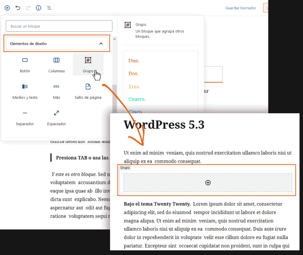 Quizás debido al cumplimiento del aniversario de su gestación, quizás no, el caso es que Gutenberg cuenta ahora con un compendio de nuevos ítems, y el más relevante es quizás el Agrupador de Bloques. Esta herramienta te permite asociar bloques continuos, de modo que, por ejemplo, te sea posible asignarles a todos ellos un fondo en común (mientras que, a un grupo siguiente, puedas asignarle otro fondo, creando secciones que se relacionarán gracias a su fondo en común).