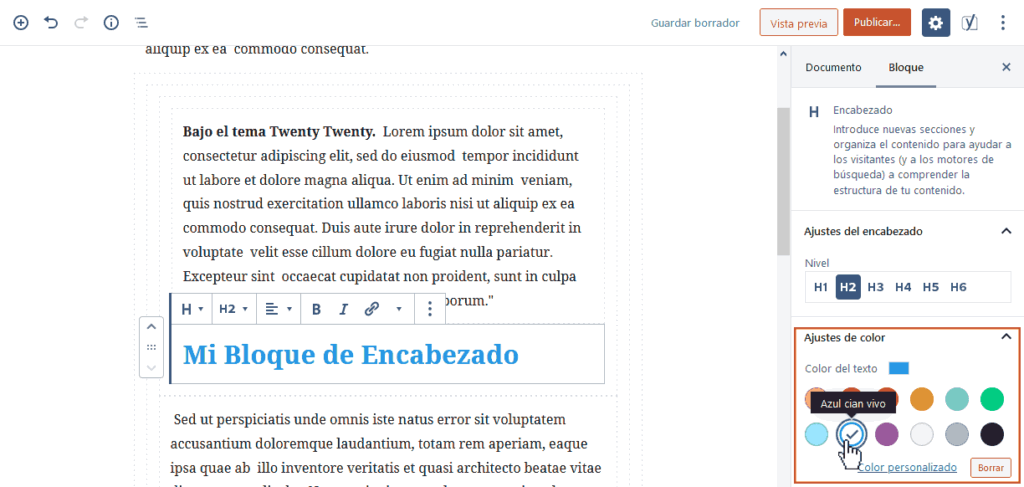 Algo muy solicitado, finalmente WordPress 5.3 permite que configures tu Bloque de Encabezado con el color que desees (otrora sencillamente seteado por defecto según la paleta del tema que se emplee). Si bien al crear el bloque, seguirás viendo un color por defecto, podrás cambiarlo a gusto en la paleta tal cual se enseña en la captura inferior, o incluso, para los administradores más avanzados, seleccionar “color personalizado” e ingresar un código de color en hexadecimal.