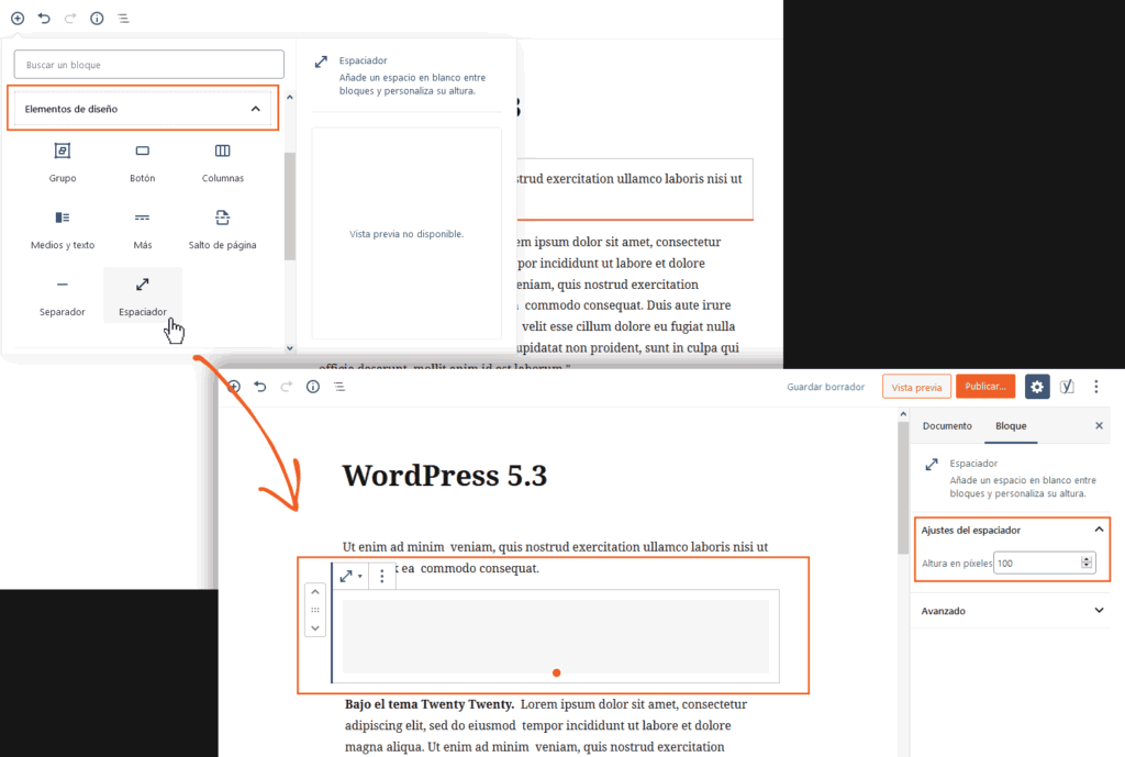 Algo ya común en otros constructores como Elementor, Beaver y demás, ahora Gutenberg también posee su Espaciador. Si no sabes de qué se trata, te cuento que es un zócalo vacío, de altura configurable, que permite separar a otros bloques entre sí.