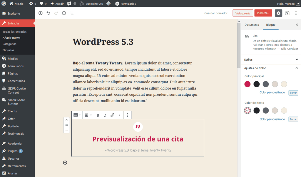 Para sentirnos más como “en casa”, el editor de bloques, entre otros cambios relacionados a la previsualización, presenta de fondo de color de tu tema en lugar de un fondo blanco por defecto. En otras palabras, se han realizado esfuerzos para homogeneizar más el contenido front-end con la edición del back-end. Y el nuevo tema Twenty Twenty enseña perfectamente esto al previsualizar el diseño de los bloques según los vamos empleando, todo para tener una mejor concepción in situ durante la creación del contenido.