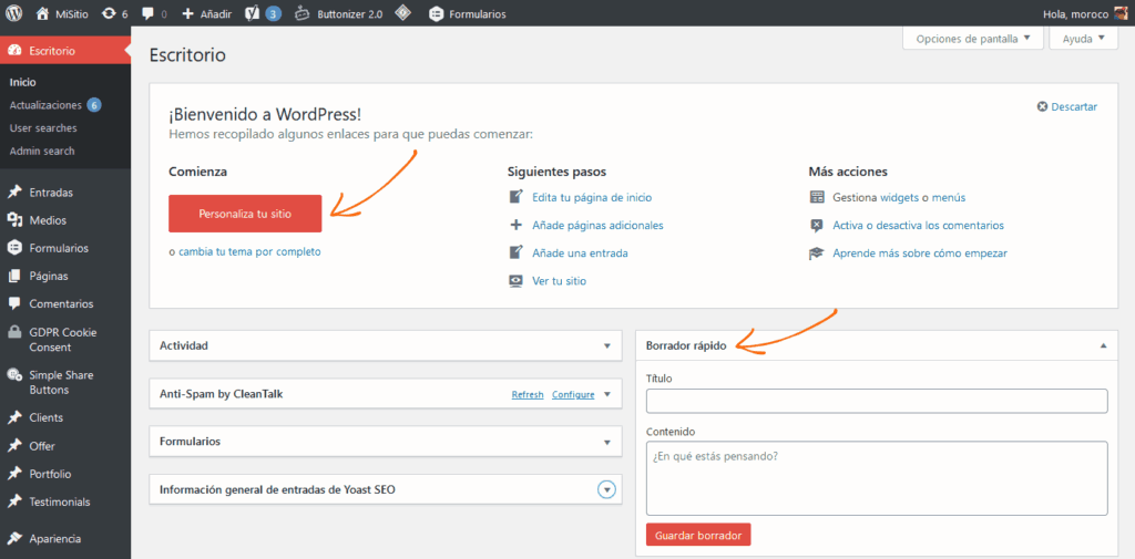 Los administradores de WordPress agradecerán algunos cambios relacionados a la velocidad de edición: ¿deseas generar una nota de borrador de manera inmediata? ¡Pues hazlo desde el Escritorio! Además, es útil un atajo llamativo para modificar aspectos de diseño de tu tema (“personalizar tu sitio”), puesto que se trata de uno de los accesos más empleados por los diseñadores.
