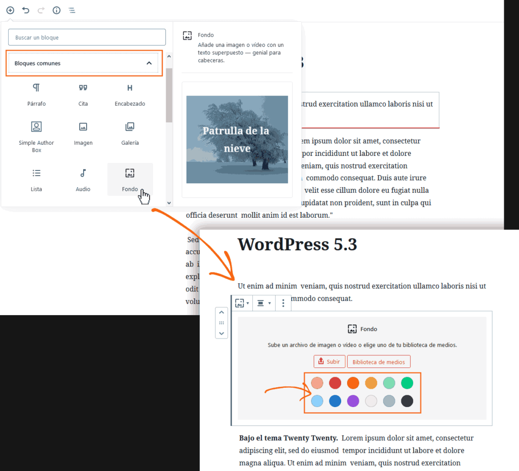El Bloque de Fondo te permite añadir imagen ó video con un texto superpuesto (común en los encabezados de una puesta). A partir de la versión de WordPress 5.3 podrás incluir un color de fondo.