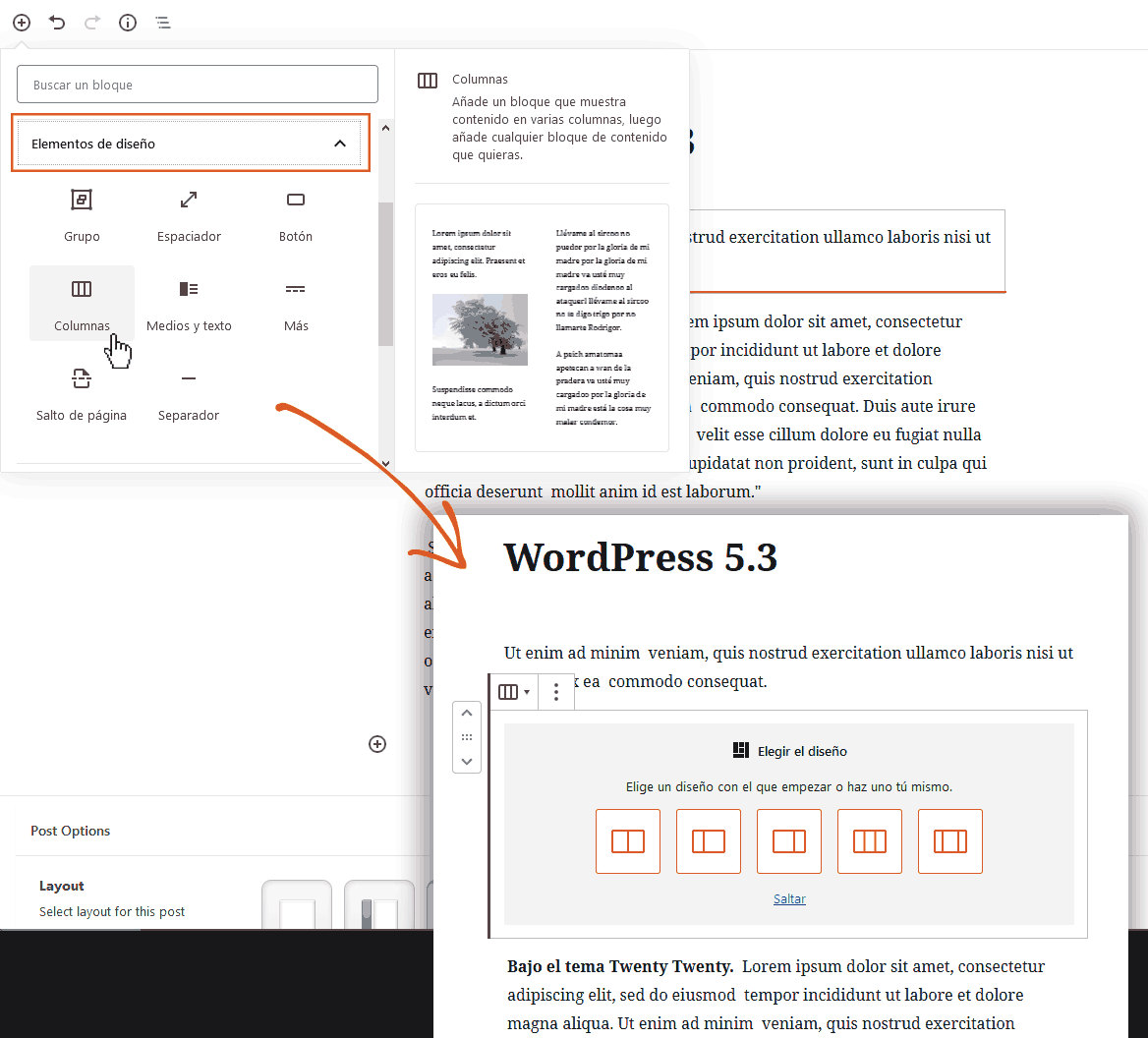 Para sentirnos más como “en casa”, el editor de bloques, entre otros cambios relacionados a la previsualización, presenta de fondo de color de tu tema en lugar de un fondo blanco por defecto. En otras palabras, se han realizado esfuerzos para homogeneizar más el contenido front-end con la edición del back-end. Y el nuevo tema Twenty Twenty enseña perfectamente esto al previsualizar el diseño de los bloques según los vamos empleando, todo para tener una mejor concepción in situ durante la creación del contenido.