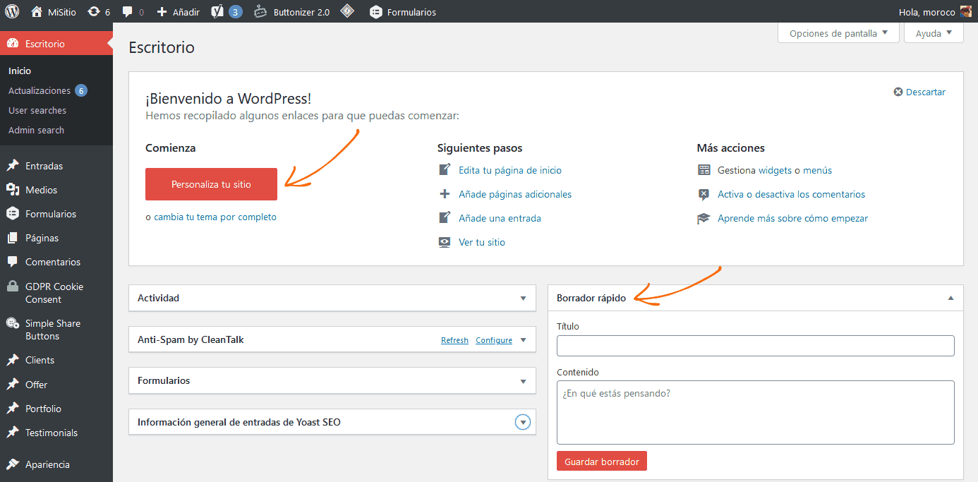 Los administradores de WordPress agradecerán algunos cambios relacionados a la velocidad de edición: ¿deseas generar una nota de borrador de manera inmediata? ¡Pues hazlo desde el Escritorio! Además, es útil un atajo llamativo para modificar aspectos de diseño de tu tema (“personalizar tu sitio”), puesto que se trata de uno de los accesos más empleados por los diseñadores.