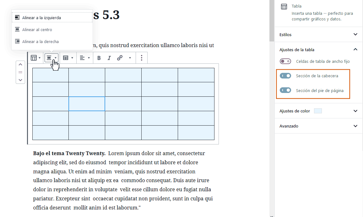 A partir de la nueva versión de WordPress, podrás incorporar encabezados y pie de páginas para tus tablas. Además, se ha añadido la posibilidad de modificar la alineación de la tabla entera y no solamente del texto, como ocurría en la versión anterior.