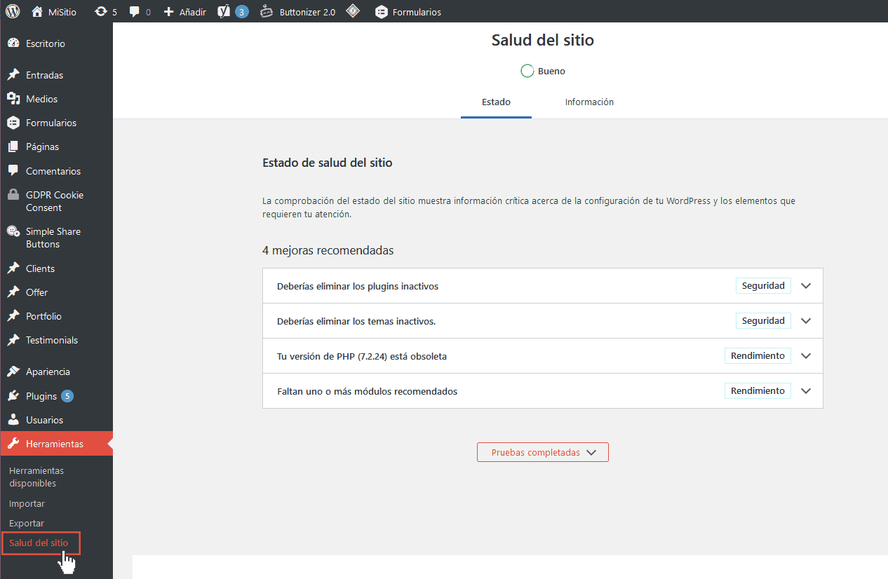 A fin de poder identificar y resolver problemas en tu sitio con antelación, WordPress 5.3 ha mejorado mucho sus herramientas natales de comprobación y diagnóstico de errores. Principalmente, se ha modificado el indicador gradual de problemas, también optimizado el sistema de recuperación de correo, y añadido un repertorio de filtros para un mejor examen del estado de salud de tu web.