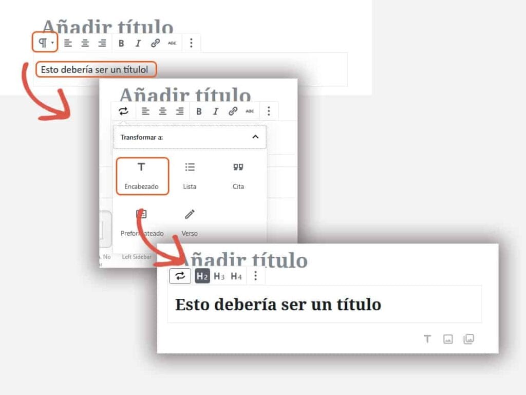 Siguiendo el ejemplo, para decirle a WordPress que cierta oración o palabra es un Heading, debemos atravesar estos pasos: